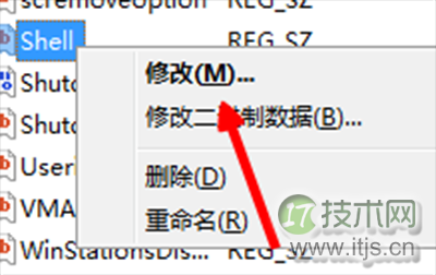找到了上面的一步以后,我们会在右侧看到有一个shell的,我们先鼠标选中,然后点击右键选择修改。