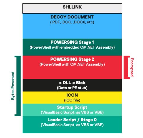 尽管看起来像来自Explorer或流行的存档提取产品的文档,但它的快捷键指向cmd.exe。这些快捷方式文件的结构如下: