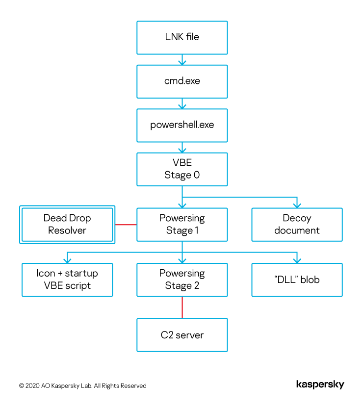 点击它们就会启动一个复杂的序列,导致在受害者的计算机上执行任意代码。通过cmd.exe的参数传递的简短PowerShell脚本引导了以下链: