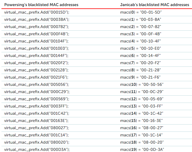 此外,此样本包含的黑名单VM MAC地址列表与本文前面介绍的Powersing样本完全相同,顺序相同。