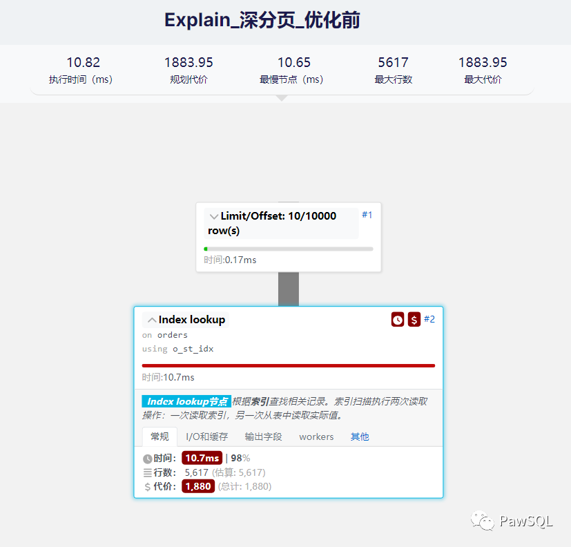 复制select * from orders where O_ORDERSTATUS =1 order by O_ORDERKEY limit 10000,深分 10;1.优化的重点就在减少回表上,采用的高级方法是子查询+覆盖索引,对于以上的优页优SQL,可以重写为: