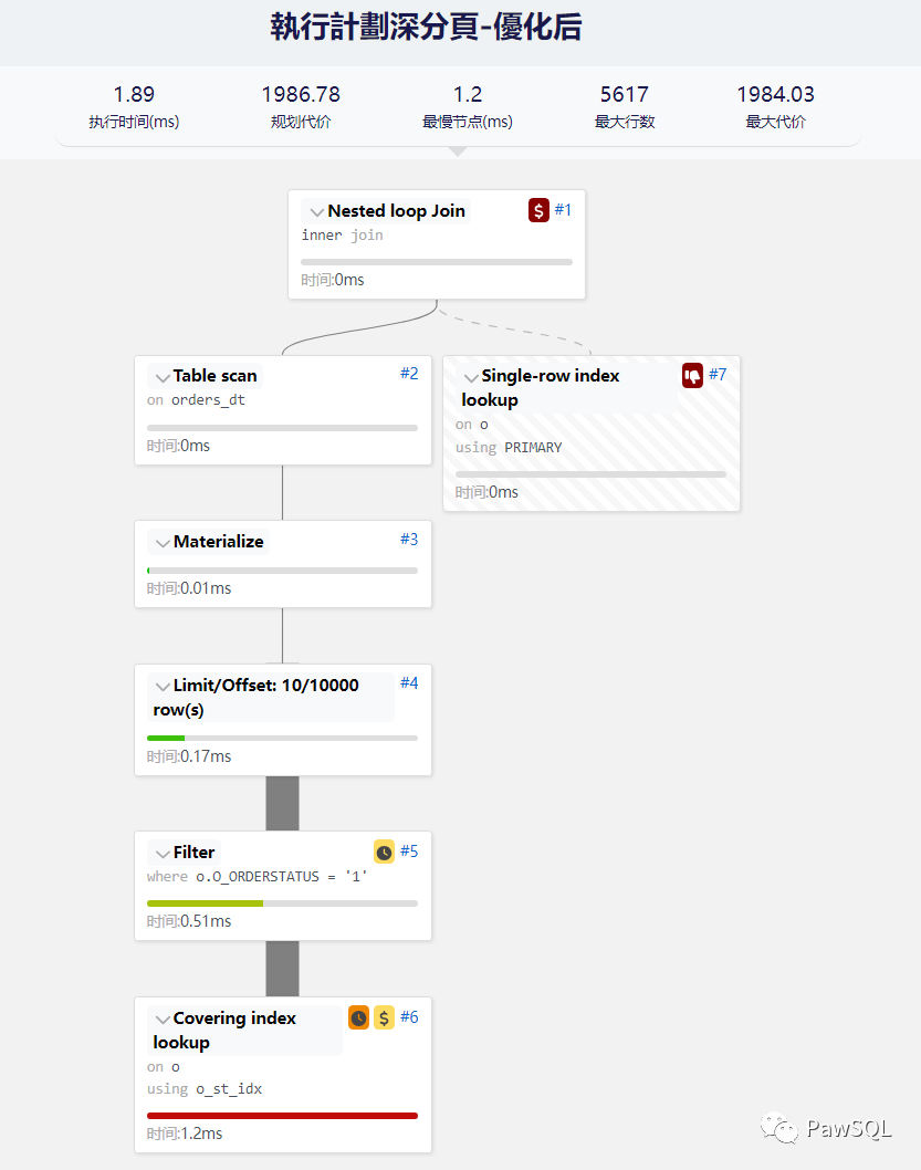 从执行计划可以看到,左侧就是通过索引获得满足符合条件的十个记录编号(主键),然后和数据表关联获取所需的字段。虽然代价估计是更大了,但是时间的执行时间却变小了,性能提升了534.96%。