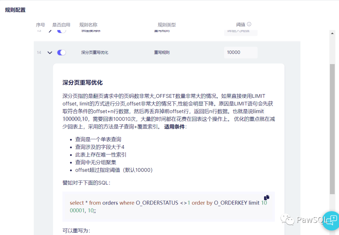 在PawSQL中实现了深分页的自动优化,用户可以指定深分页的深度,当分页的企商汇深度超过指定阈值,PawSQL可以自动进行此优化。
