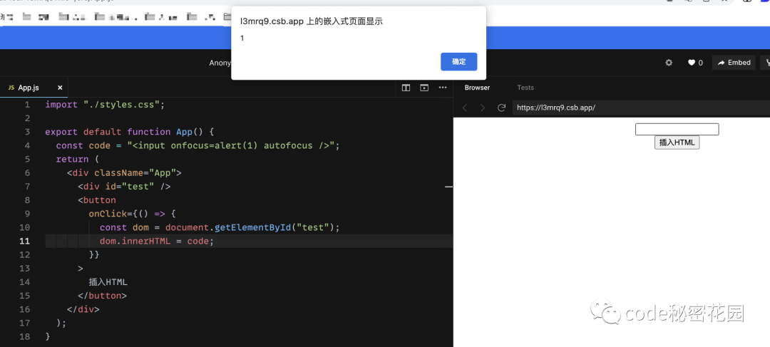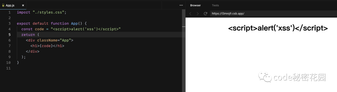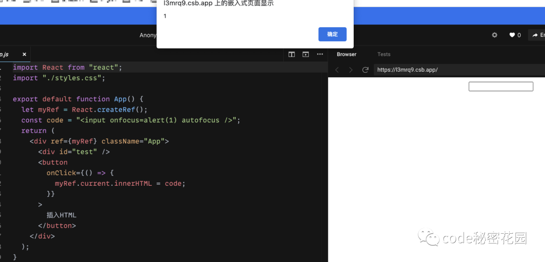 <div className="App"> 测试 URL 注入 <a href={isSafe(code)}>一个平平无奇的链接</a> </div>);