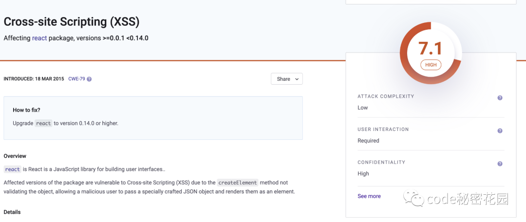 }1.2.3.4.5.6.7.8.9.10.11.12.13.14.15.16.17.18. 避免有漏洞的 React 版本React 以前也被测试出有比较高危的安全漏洞,建议经常保持更新,来避免这些有漏洞的 React 版本: