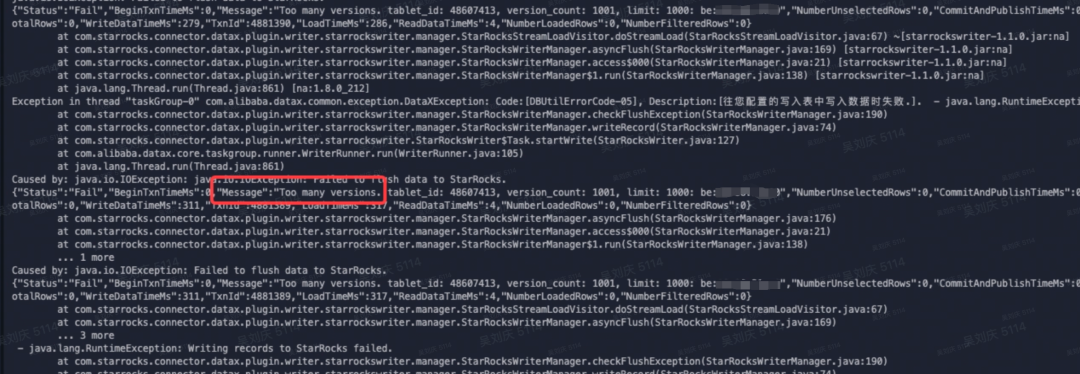 单表在导入千万级别的数据后,经常会报“Too many version”,导致同步任务失败,原因是导入频率太快,数据没能及时合并,从而导致版本数超过参数限制的tablet最大版本数。默认支持的最大未合并版本数为 1000。此时有两种方式解决:一是数据库服务端调高BE的合并参数,加快数据的合并,但注意此时会增加数据库CPU、内存等资源的消耗;二是数据导入端可以通过增大单次导入数据量,减少导入的频率来解决,StarRocks的通过以下3个参数来控制导入,但需要将同步任务转换为代码模式,并在Writer节点的parameter参数中进行添加。