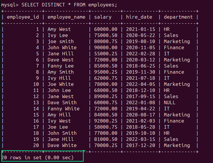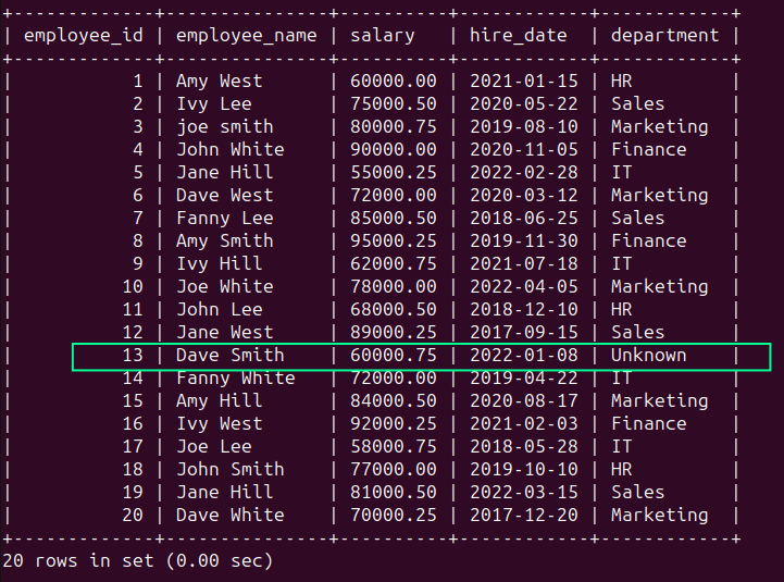 复制-- 插入20个样本记录 INSERT INTO employees (employee_id, employee_name, salary, hire_date, department) VALUES (1, Amy West, 60000.00, 2021-01-15, HR), (2, Ivy Lee, 75000.50, 2020-05-22, Sales), (3, joe smith, 80000.75, 2019-08-10, Marketing), (4, John White, 90000.00, 2020-11-05, Finance), (5, Jane Hill, 55000.25, 2022-02-28, IT), (6, Dave West, 72000.00, 2020-03-12, Marketing), (7, Fanny Lee, 85000.50, 2018-06-25, Sales), (8, Amy Smith, 95000.25, 2019-11-30, Finance), (9, Ivy Hill, 62000.75, 2021-07-18, IT), (10, Joe White, 78000.00, 2022-04-05, Marketing), (11, John Lee, 68000.50, 2018-12-10, HR), (12, Jane West, 89000.25, 2017-09-15, Sales), (13, Dave Smith, 60000.75, 2022-01-08, NULL), (14, Fanny White, 72000.00, 2019-04-22, IT), (15, Amy Hill, 84000.50, 2020-08-17, Marketing), (16, Ivy West, 92000.25, 2021-02-03, Finance), (17, Joe Lee, 58000.75, 2018-05-28, IT), (18, John Smith, 77000.00, 2019-10-10, HR), (19, Jane Hill, 81000.50, 2022-03-15, Sales), (20, Dave White, 70000.25, 2017-12-20, Marketing);1.2.3.4.5.6.7.8.9.10.11.12.13.14.15.16.17.18.19.20.21.22.如果你能注意到的话,在这里使用了一小部分名字和姓氏作为样本,并为记录构建了姓名字段。不过,你也可以对记录进行更有创意的处理。