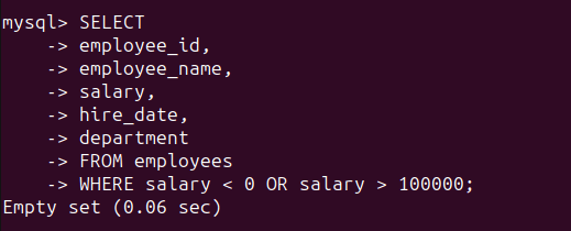 复制SELECT employee_id, employee_name, salary, hire_date, department FROM employees WHERE salary < 0 OR salary > 100000;1.2.3.4.5.6.7.8.如图所示,salary列值都在0和100000之间。因此,结果集为空: