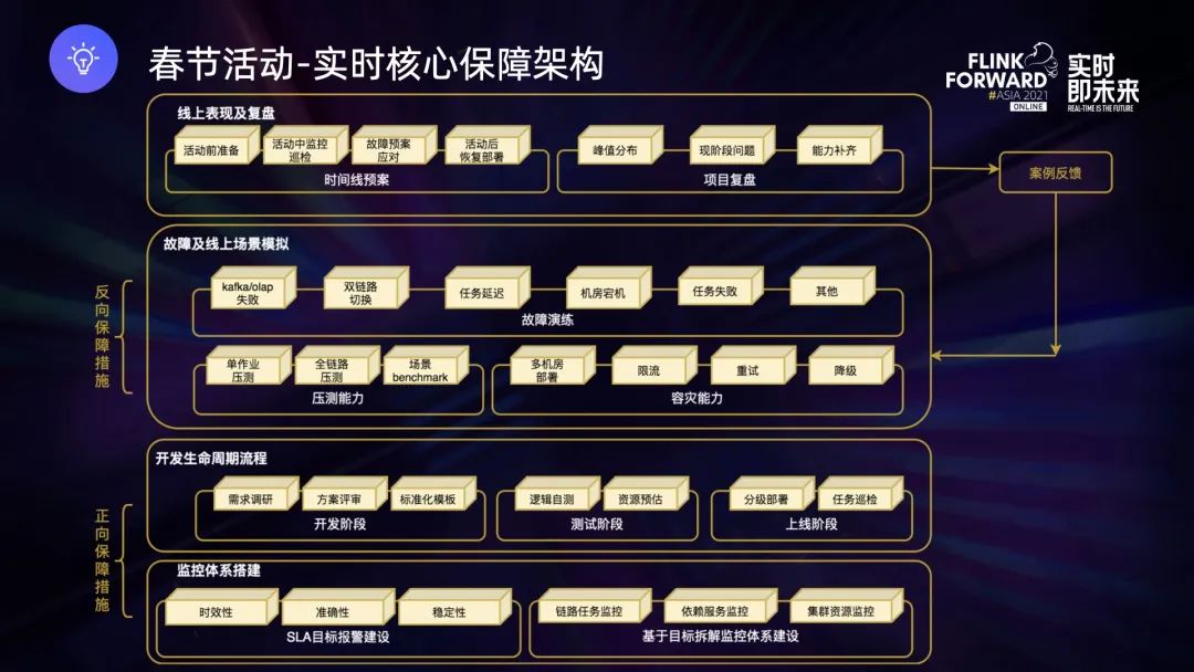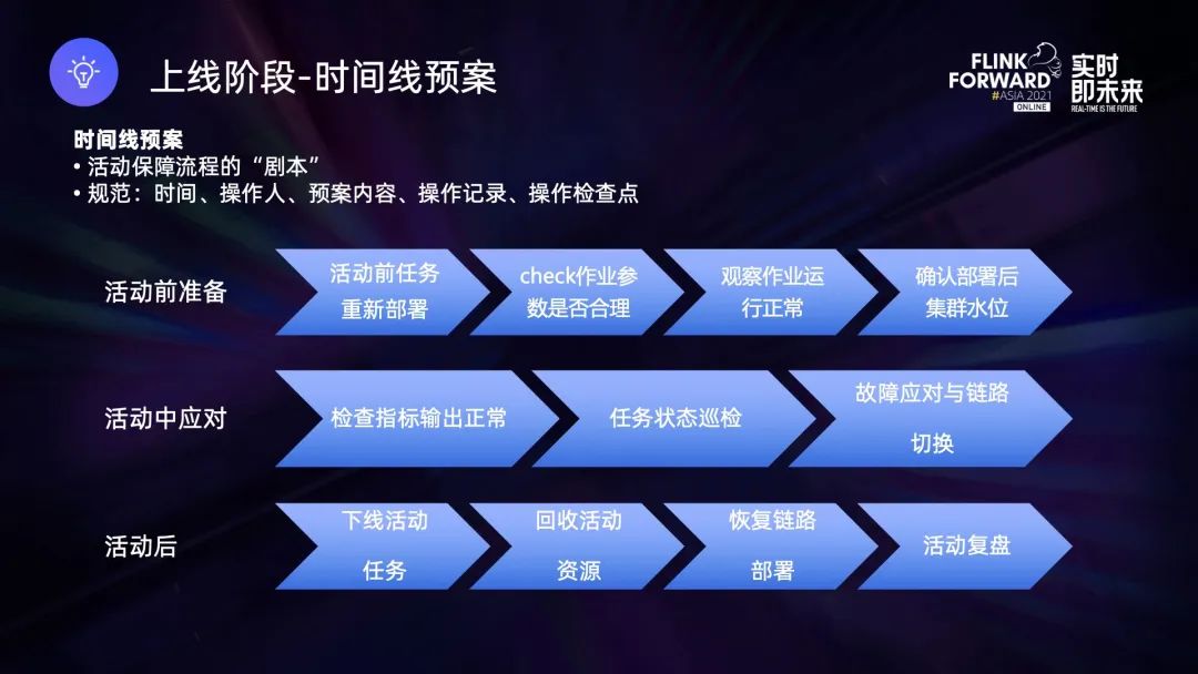 活动前,部署任务确保没有计算热点、check 参数是否合理、观察作业情况以及集群情况;活动中,检查指标输出是否正常、任务状态巡检以及遇到问题的故障应对和链路切换;活动后,下线活动任务、回收活动资源、恢复链路部署及复盘。