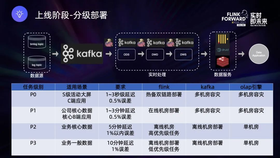 P0 任务是活动大屏,C 端应用对于 SLA 的要求是秒级延迟以及 0.5% 内误差,但是整体保障时间比较短,一般活动周期都在 20 天左右,除夕类活动 1~2 天内完成。我们应对延迟的方案是针对于 Kafka 和 OLAP 引擎都进行了多机房容灾,针对于 Flink 做了热备双机房部署。针对 P1 级别的任务,我们对 Kafka 和 OLAP 引擎进行双机房部署,一方面双机房部署可以做容灾逃生,另一方面在线机房的配置比较好,很少出现机器故障导致作业重启的情况。针对 P2 和 P3 级别的任务,我们在离线机房部署,如果存在一些资源空缺的情况,会先停止 P3 任务,腾挪资源给其他任务使用。