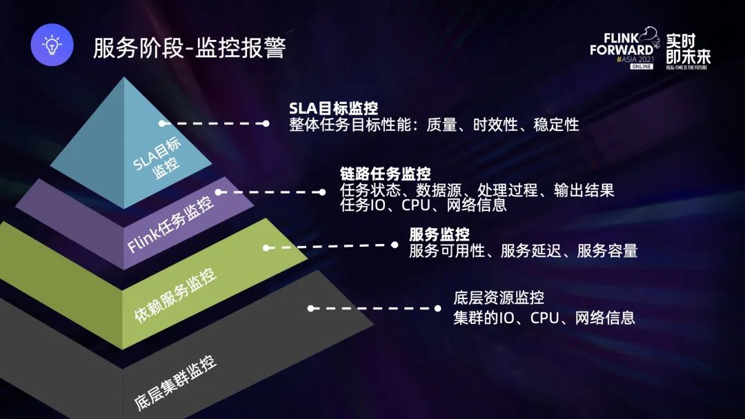第一,SLA 监控主要监控整体产出指标的质量、时效性和稳定性。第二,链路任务监控主要对任务状态、数据源、处理过程、输出结果以及底层任务的 IO、CPU 网络、信息做监控。第三,服务监控主要包括服务的可用性和延迟。最后是底层的集群监控,包括底层集群的 CPU、IO 和内存网络信息。