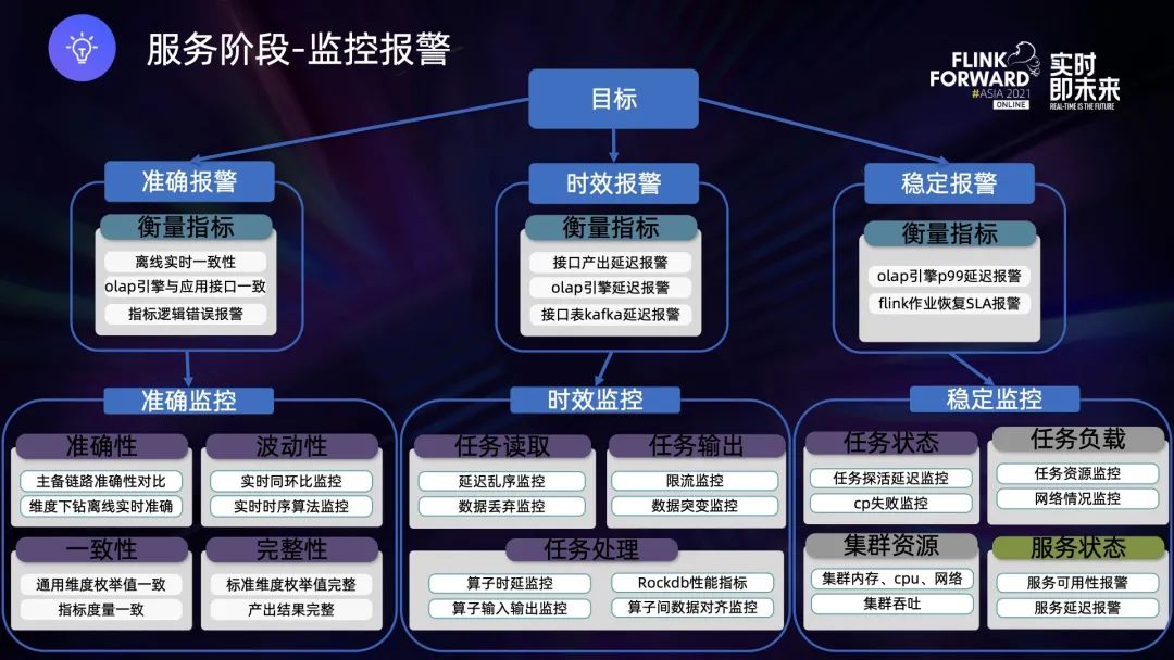 准确性的目标具体包括以下三部分:离线实时指标一致性用来保障整体的数据处理逻辑是正确的,OLAP 引擎和应用接口一致性用来保证服务的处理逻辑是正确的,指标逻辑错误报警用来保障业务逻辑是正确的。