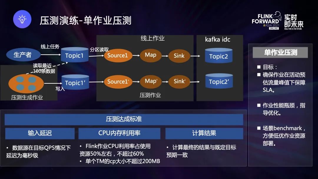 读取压测的数据源 topic 并经过作业处理生成新的 topic 后,如何判断压测是否真正通过,有三个标准:第一,确保作业输入读取延迟为毫秒级,且作业本身无任何反压。第二,CPU的利用率不超过整体资源的 60%,保障集群有空余 buffer。第三,计算结果和人群包保持一致,证明逻辑是正确的。