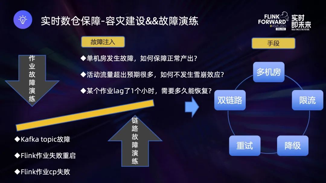 一个是单作业的故障演练,包括 Kafka topic 作业故障、Flink 作业失败以及 Flink 作业 CP 失败。二是更体系化的故障,比如链路故障,比如单机房故障如何保障正常产出,活动流量超过预期很多如何避免雪崩效应?某个作业 lag 超过一个小时,需要多久能恢复?