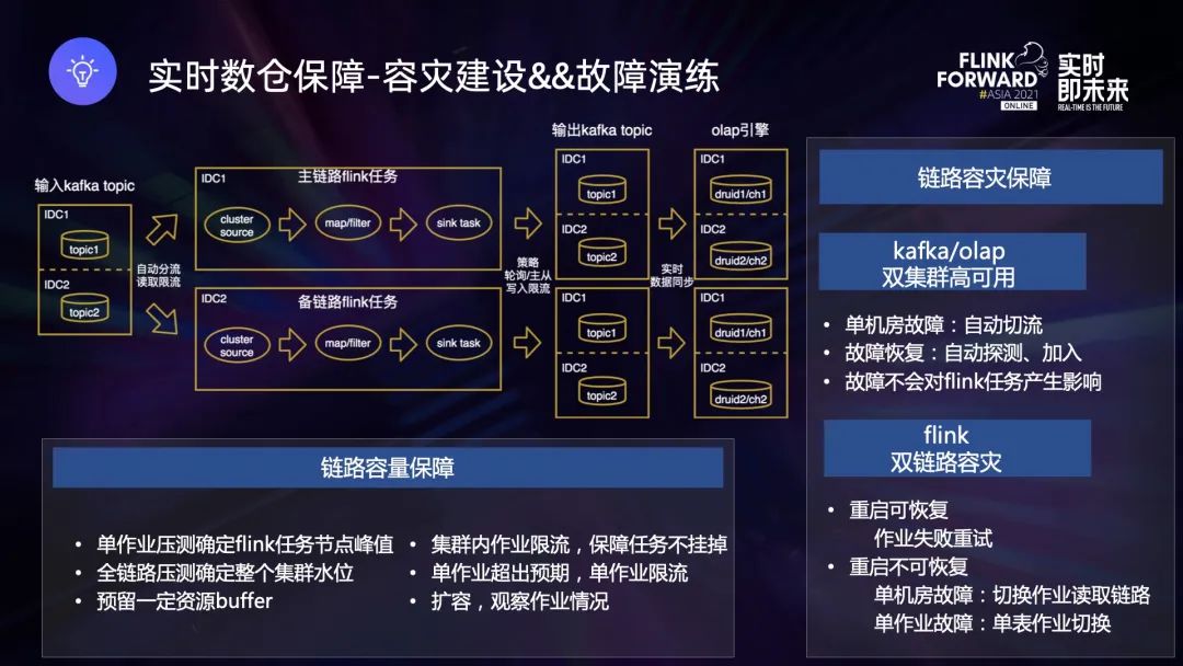 链路的故障容灾保障核心是解决单机房和单作业失败恢复时间长的问题和服务的稳定性问题。Kafka 本身可以做双机房容灾,生成流量会写入到两个机房的 Kafka,出现单机房故障时会自动把流量切换到另外一个机房,而且保证 Flink 作业无感知。另外一方面机房故障恢复之后,可以自动探测 Kafka 机房的状态加入流量。