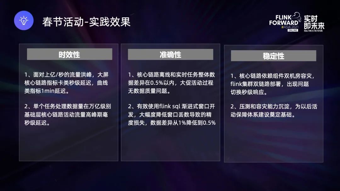 春节活动的实践获得了巨大的成功。时效性方面,面对上亿级别的流量洪峰,大屏核心链路指标卡秒级延迟,曲线类一分钟内延迟,单个任务处理数据量在万亿级别之上,在流量高峰期是秒级延迟。准确性方面,核心链路离线和实时任务差异 0.5% 以内,大促活动过程无数据质量问题,有效使用 FlinkSQL 渐进式窗口开发,大幅度降低窗口丢失导致的精度损失,数据差异从 1% 降到 0.5%。稳定性方面,核心链路依赖组建双机房容灾、Flink 集群热备双链路部署,出现问题秒级切换,压测和容灾能力的沉淀,为以后的活动保障体系建设奠定基础。