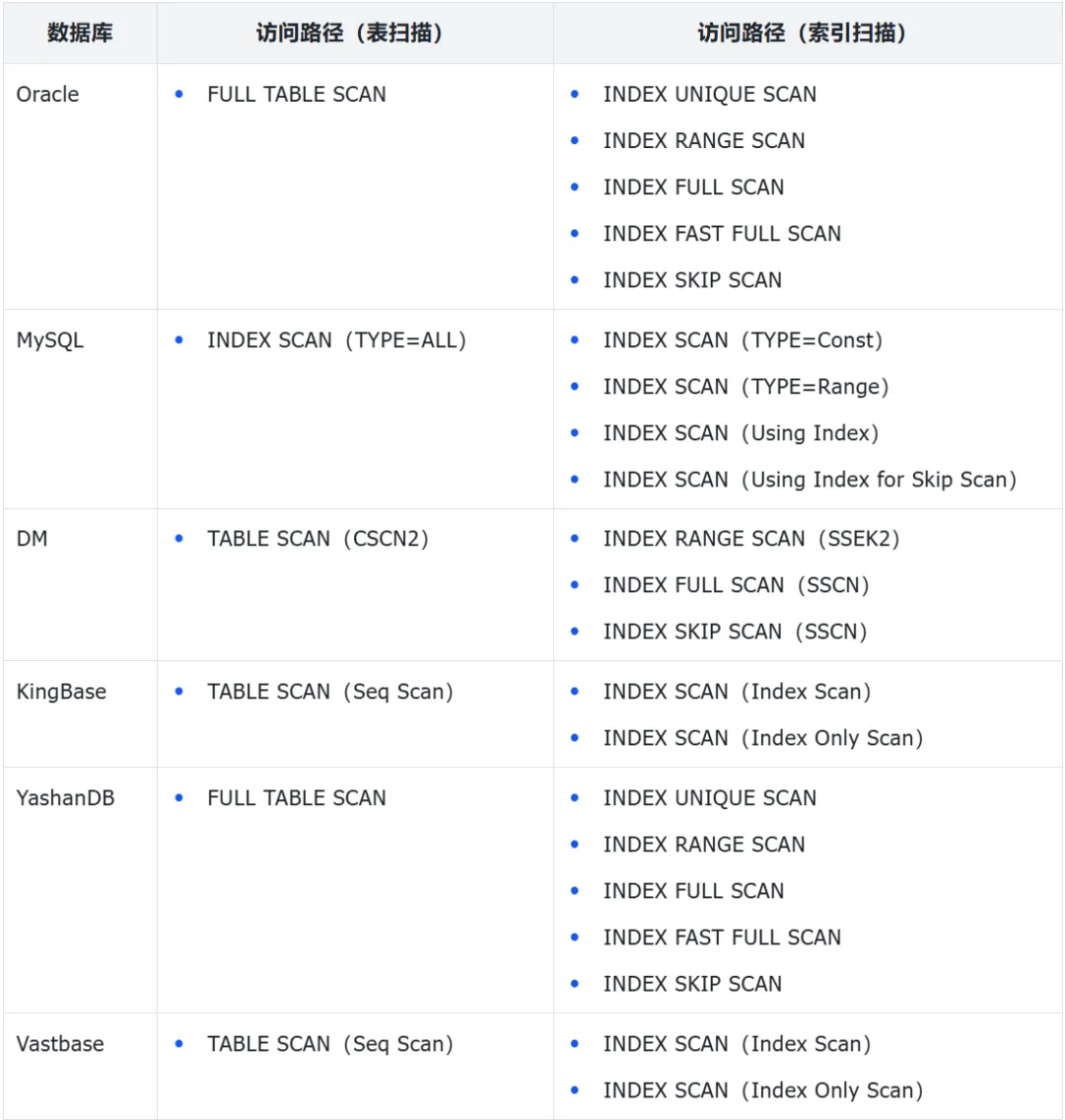 复制-- 表扫描:全表扫描 SQL> explain plan for select * from emp; +----+--------------------------------+----------------------+------------+----------+-------------+--------------------------------+ | Id | Operation type | Name | Owner | Rows | Cost(%CPU) | Partition info | +----+--------------------------------+----------------------+------------+----------+-------------+--------------------------------+ | 0 | SELECT STATEMENT | | | | | | | 1 | TABLE ACCESS FULL | EMP | TESTUSER | 10000| 41( 0)| | +----+--------------------------------+----------------------+------------+----------+-------------+--------------------------------+ -- 索引扫描:索引唯一扫描(index unique scan) SQL> explain select * from emp where emp_id=111; +----+--------------------------------+----------------------+------------+----------+-------------+--------------------------------+ | Id | Operation type | Name | Owner | Rows | Cost(%CPU) | Partition info | +----+--------------------------------+----------------------+------------+----------+-------------+--------------------------------+ | 0 | SELECT STATEMENT | | | | | | | 1 | TABLE ACCESS BY INDEX ROWID | EMP | TESTUSER | 1| 1( 0)| | |* 2 | INDEX UNIQUE SCAN | EMP_PK | TESTUSER | 1| 1( 0)| | +----+--------------------------------+----------------------+------------+----------+-------------+--------------------------------+ -- 索引扫描:索引范围扫描(index range scan) SQL> explain select * from emp where emp_id<100; +----+--------------------------------+----------------------+------------+----------+-------------+--------------------------------+ | Id | Operation type | Name | Owner | Rows | Cost(%CPU) | Partition info | +----+--------------------------------+----------------------+------------+----------+-------------+--------------------------------+ | 0 | SELECT STATEMENT | | | | | | | 1 | TABLE ACCESS BY INDEX ROWID | EMP | TESTUSER | 100| 1( 0)| | |* 2 | INDEX RANGE SCAN | EMP_PK | TESTUSER | 100| 1( 0)| | +----+--------------------------------+----------------------+------------+----------+-------------+--------------------------------+ -- 索引扫描:索引快速全扫描(index fast full scan) SQL> explain select emp_name from emp; +----+--------------------------------+----------------------+------------+----------+-------------+--------------------------------+ | Id | Operation type | Name | Owner | Rows | Cost(%CPU) | Partition info | +----+--------------------------------+----------------------+------------+----------+-------------+--------------------------------+ | 0 | SELECT STATEMENT | | | | | | | 1 | INDEX FAST FULL SCAN | IDX_EMP_NAME | TESTUSER | 10000| 29( 0)| | +----+--------------------------------+----------------------+------------+----------+-------------+--------------------------------+ -- 索引扫描:索引全扫描(index full scan) exec dbms_stats.set_table_stats(TESTUSER,EMP,null,1000000,5000,34); //通过伪造统计信息,放大表扫描的成本,让优化器选择使用索引全扫描 SQL> explain select emp_name from emp order by 1; +----+--------------------------------+----------------------+------------+----------+-------------+--------------------------------+ | Id | Operation type | Name | Owner | Rows | Cost(%CPU) | Partition info | +----+--------------------------------+----------------------+------------+----------+-------------+--------------------------------+ | 0 | SELECT STATEMENT | | | | | | | 1 | INDEX FULL SCAN | IDX_EMP_NAME | TESTUSER | 1000000| 29( 0)| | +----+--------------------------------+----------------------+------------+----------+-------------+--------------------------------+ -- 索引扫描:索引跳跃扫描(index skip scan) SQL> create table t as select 1 id,object_name from dba_objects; SQL> insert into t select 2 ,object_name from dba_objects; ... SQL> create index idx_t on t(id,object_name); SQL> exec dbms_stats.gather_table_stats(user,t,cascade=>true); SQL> explain select * from t where object_name=TEST; +----+--------------------------------+----------------------+------------+----------+-------------+--------------------------------+ | Id | Operation type | Name | Owner | Rows | Cost(%CPU) | Partition info | +----+--------------------------------+----------------------+------------+----------+-------------+--------------------------------+ | 0 | SELECT STATEMENT | | | | | | |* 1 | INDEX SKIP SCAN | IDX_T | TESTUSER | 1| 3( 0)| | +----+--------------------------------+----------------------+------------+----------+-------------+--------------------------------+ -- 表扫描:全表扫描 SQL> explain plan for select * from emp; +----+--------------------------------+----------------------+------------+----------+-------------+--------------------------------+ | Id | Operation type | Name | Owner | Rows | Cost(%CPU) | Partition info | +----+--------------------------------+----------------------+------------+----------+-------------+--------------------------------+ | 0 | SELECT STATEMENT | | | | | | | 1 | TABLE ACCESS FULL | EMP | TESTUSER | 10000| 41( 0)| | +----+--------------------------------+----------------------+------------+----------+-------------+--------------------------------+ -- 索引扫描:索引唯一扫描(index unique scan) SQL> explain select * from emp where emp_id=111; +----+--------------------------------+----------------------+------------+----------+-------------+--------------------------------+ | Id | Operation type | Name | Owner | Rows | Cost(%CPU) | Partition info | +----+--------------------------------+----------------------+------------+----------+-------------+--------------------------------+ | 0 | SELECT STATEMENT | | | | | | | 1 | TABLE ACCESS BY INDEX ROWID | EMP | TESTUSER | 1| 1( 0)| | |* 2 | INDEX UNIQUE SCAN | EMP_PK | TESTUSER | 1| 1( 0)| | +----+--------------------------------+----------------------+------------+----------+-------------+--------------------------------+ -- 索引扫描:索引范围扫描(index range scan) SQL