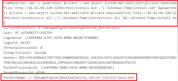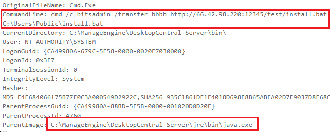 我们的分析师观察到,bitsadmin命令正在Desktop Central服务器上运行,该命令包含在PowerShell下载命令中调用的相同IP地址,端口和相同的install.bat文件(图17)。