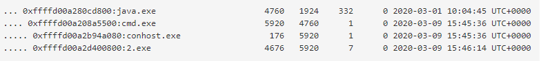 查看内存中的进程,我们还观察到Desktop Central java.exe应用程序cmd.exe和2.exe之间的父/子进程关系(图7)。