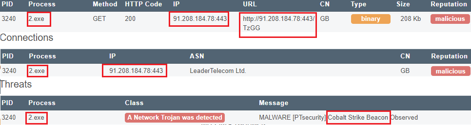 利用app.any.run沙箱(图12)和对恶意软件的内存分析,进一步证实2.exe托管Cobalt Strike Beacon payload的可能性。