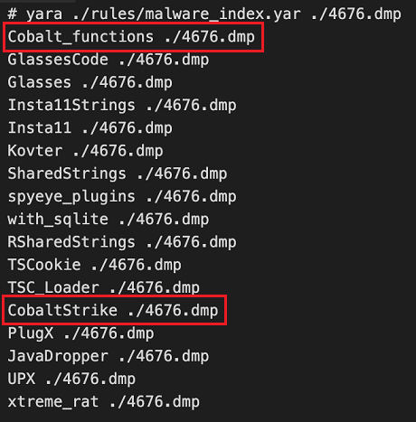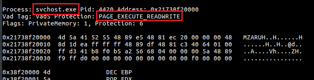 利用Volatility的恶意插件,我们确定了几个可能存在代码注入迹象的内存部分,我们对另一个由malfind转储的内存段进行了yara扫描,进一步证实了我们的猜想。