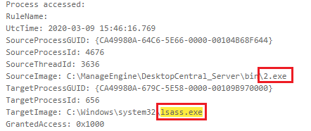 我们还观察到了潜在的凭证访问活动。攻击者执行凭据转储的常用技术是使用恶意进程(SourceImage)访问另一个进程(TargetImage),最常见的是将lsass.exe作为目标,因为它通常包含敏感信息,例如帐户凭据。