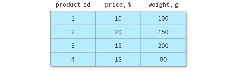 它描述了一个网上商店的多样化产品线,总共有四种不同的产品。与前面的例子相比,它既可以用NumPy数组表示,也可以用Pandas DataFrame表示,效果同样不错。但来看看它的一些常见操作。