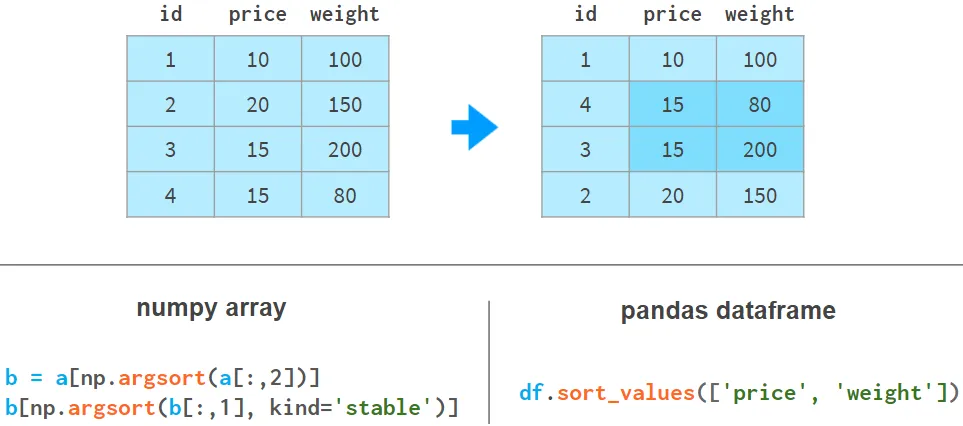 如果选择使用NumPy,我们首先按重量排序,然后再按价格应用第二次排序。一个稳定的排序算法可以保证第一次排序的结果在第二次排序时不会丢失。用NumPy还有其他方法,但都不如用Pandas简单和优雅。