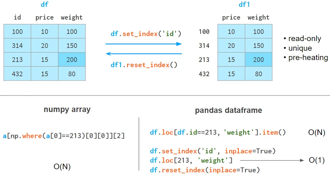 4.快速元素搜索对于NumPy数组,即使搜索的元素是第一个,仍然需要与数组大小成比例的时间来找到它。使用Pandas,可以对我们预期最常被查询的列进行索引,并将搜索时间减少到On。