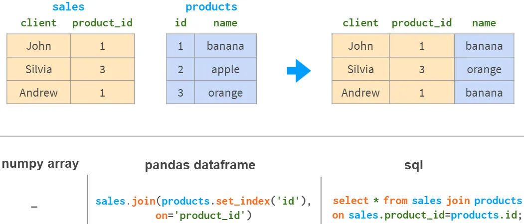 如果想用另一个表的信息来补充一个基于共同列的表,NumPy几乎没有用。而Pandas更好,特别是对于1:n的关系。