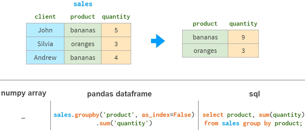 数据分析中另一个常见的操作是按列分组。例如,为了获得每种产品的总销售量,可以做如下操作: