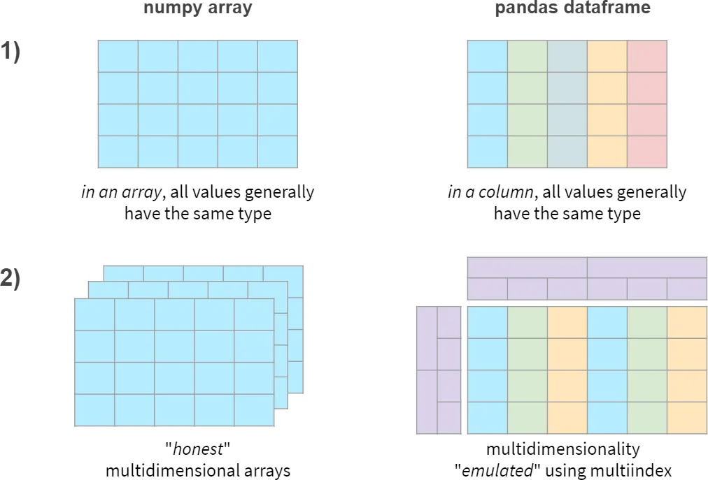 虽然NumPy也有结构化数组和记录数组,允许不同类型的列,但它们主要是为了与C代码对接。当用于一般用途时,它们有以下缺点: