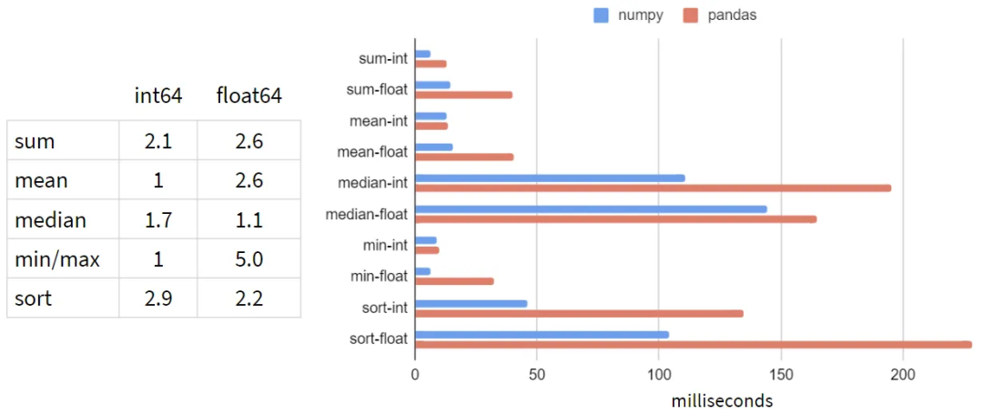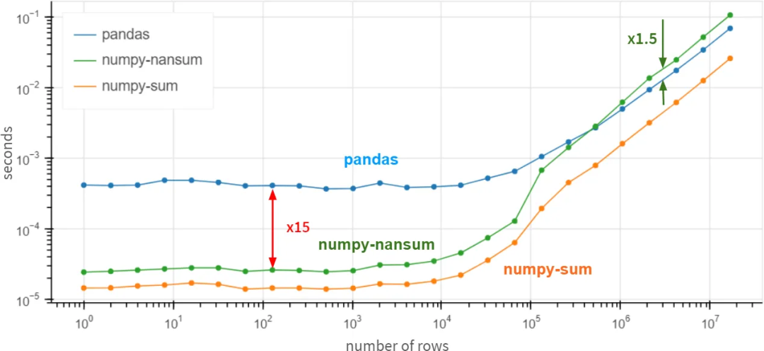 对于超过一百万元素的数组,Pandas变得比NumPy快1.5倍。对于较小的数组,它仍然比NumPy慢15倍,但通常情况下,操作在0.5毫秒或0.05毫秒内完成并不重要--反正是快了。