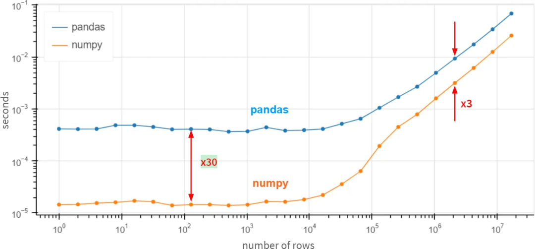对于小数组(百行以下),Pandas似乎比NumPy慢30倍,对于大数组(百万行以上)则慢3倍。