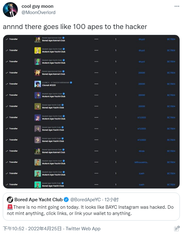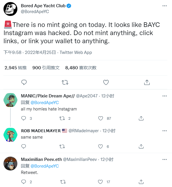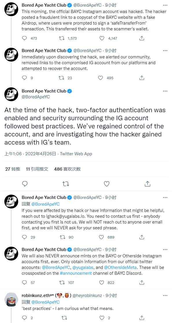 目前尚不清楚黑客是如何入侵 BAYC 官方 Instagram 账户的,Yuga Labs 在声明中称 —— 攻击发生时,他们明明已经遵从平台方的最佳安全实践、并且启用了双因素身份验证。