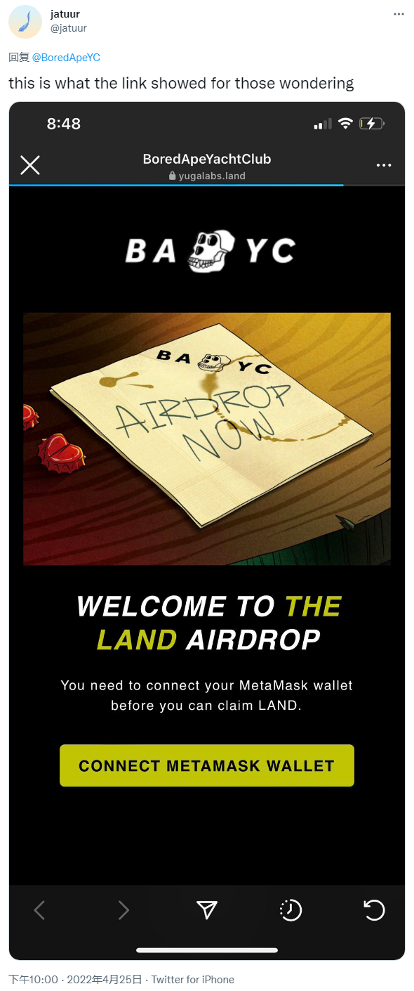 目前 Yuga Labs 团队正积极与受影响的人们取得联系,此外对于广大冲浪的用户们来说,还请不要随意点击未知链接,否则手机钱包里的资产很可能被攻击者洗劫一空。