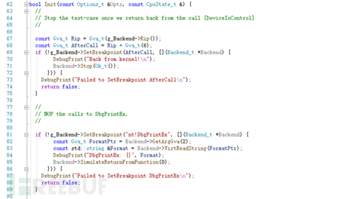 插件主要需要实现Init()和InsertTestcase()两个函数,wtf 加载内存快照后,将停留在我们打下断点/打下快照的位置,然后首先调用一次插件的Init()函数,在该函数中一般定义了:1.快照运行到何处停止、2.如何处理异常错误、3.如何处理IO 等操作,完成初始化操作后,随后将在每次执行快照前,调用InsertTestcase()函数注入测试用例。
