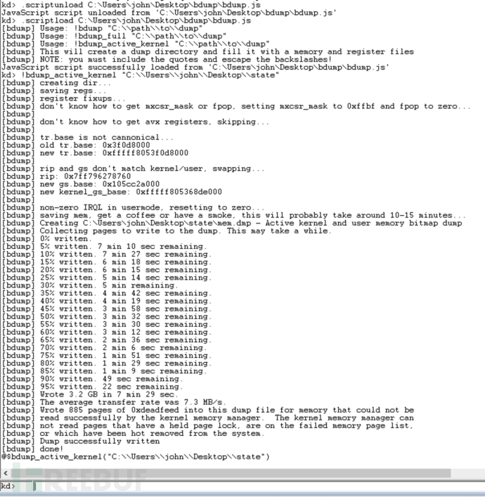 复制# 加载 bdump.js 脚本 kd> .scriptload C:\Users\john\Desktop\bdump\bdump.js # 打下内存快照,保存在 state 文件夹中 kd> !bdump_active_kernel "C:\\Users\\john\\Desktop\\state"1.2.3.4.执行如下: