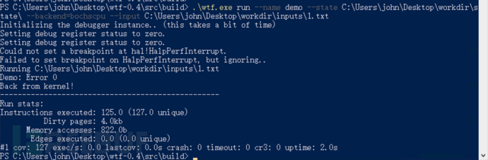 复制$ cd C:\Users\john\Desktop\wtf-0.4\src\build # 指定为 run 子命令 # --name 指定插件模块为 demo # --state 指定内存快照文件夹 # --backend 指定执行后端为 bochscpu # --input 指定输入文件 $ .\wtf.exe run --name demo --state C:\Users\john\Desktop\workdir\state\ --backend=bochscpu --input C:\Users\john\Desktop\workdir\inputs\1.txt1.2.3.4.5.6.7.执行如下: