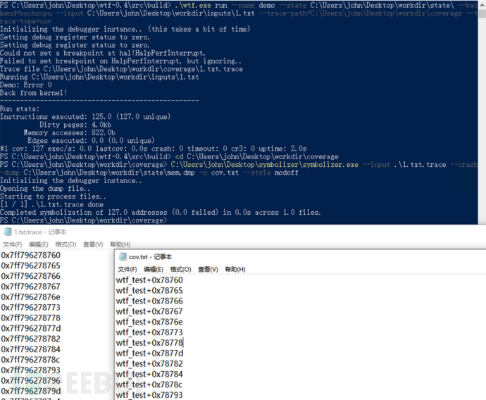 复制$ cd C:\Users\john\Desktop\wtf-0.4\src\build # 指定为 run 子命令 # --trace-path 设置覆盖率输出文件夹 # --trace-type 设置路径类型为 cov $ .\wtf.exe run --name demo --state C:\Users\john\Desktop\workdir\state\ --backend=bochscpu --input C:\Users\john\Desktop\workdir\inputs\1.txt --trace-path=C:\Users\john\Desktop\workdir\coverage --trace-type=cov1.2.3.4.5.执行完毕后将在C:\Users\john\Desktop\workdir\coverage下生成1.txt.trace文件,该文件没有符号化不能直接使用,使用作者提供的工具 symbolizer(https://github.com/0vercl0k/symbolizer</https://github.com/0vercl0k/symbolizer>) 对其进行符号化处理: