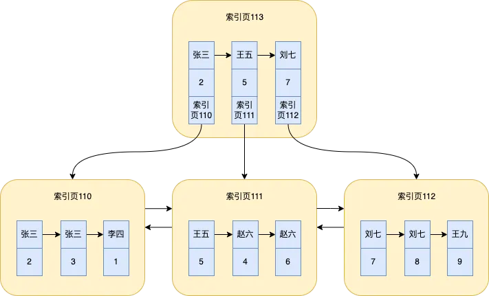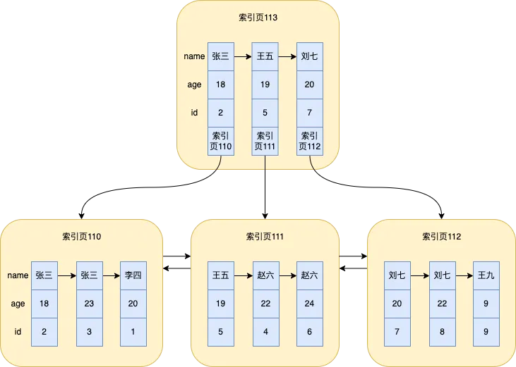 从最上面那层索引页开始二分查找,我们图中就是索引页113,如果索引页113上面还有一层,就从上面一层二分查找在索引页113查找到赵六在王五和刘七之间,之后到王五对应的索引页111上去查找赵六在索引页111找到赵六的第一条记录,也就是id=4的那条由于是select *,还要查其它字段,此时就会根据id=4到聚簇索引中查找其它字段数据,这个查找过程前面说了很多次了,这个根据id=4到聚簇索引中查找数据的过程就被称为回表由于是非唯一索引,所以赵六这个值可能会有重复,所以接着就会在索引页111顺着链表继续遍历,如果name还是赵六,那么还会根据id值进行回表,如此重复,一直这么遍历,直至name不再等于赵六为止,对于图示,其实就是两条数据从上面的二级索引的查找数据过程分析,就明白了回表的意思,就是先从二级索引根据查询条件字段值查找对应的主键id,之后根据id再到聚簇索引查找其它字段的值。