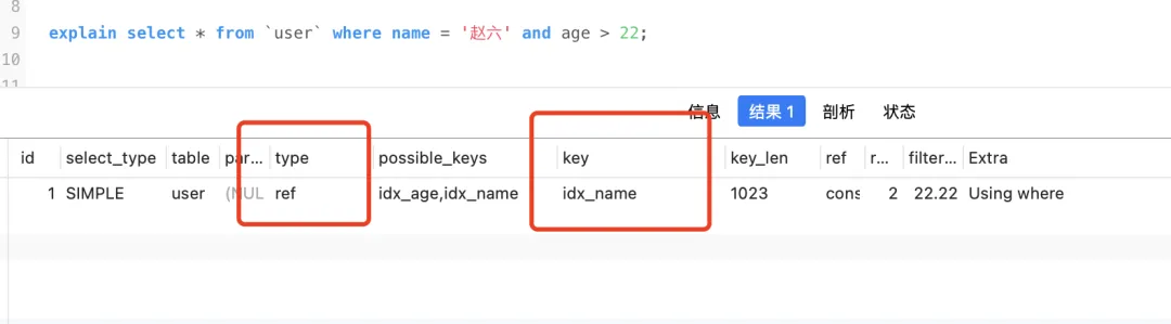 复制select * from `user` where name = 赵六 and age= 22;1.查看执行计划: