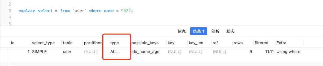 复制select * from `user` where name = 9527;1.name字段是个varchar类型,9527,没加引号,是数字,mysql根据规则会把name字段的值先转换成数字,再与9527比较,此时由于name字段发生了转换,所以索引失效了。