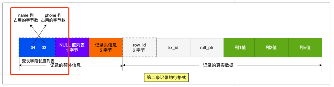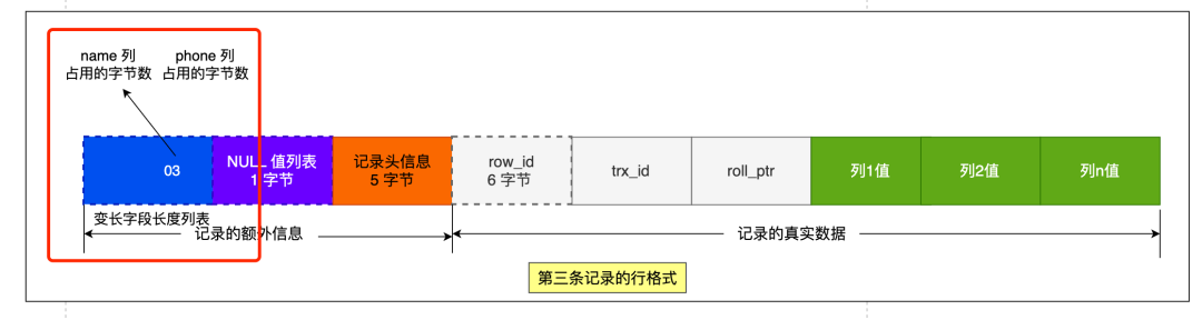 第三条记录中 phone 列的值是 NULL,NULL 是不会存放在行格式中记录的真实数据部分里的,所以「变长字段长度列表」里不需要保存值为 NULL 的变长字段的长度。