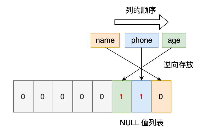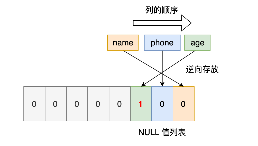 同样的道理, NULL 值列表的信息也需要逆序存放。