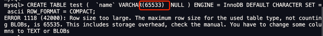 从报错信息就可以知道一行数据的最大字节数是 65535(不包含 TEXT、BLOBs 这种大对象类型),其中包含了 storage overhead。